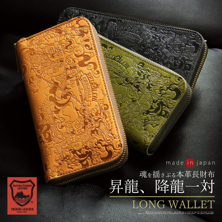 熟練の職人さんが、丁寧に一つ一つ手作りした財布です。運気を向上するともいわれる「龍」をモチーフにしています。