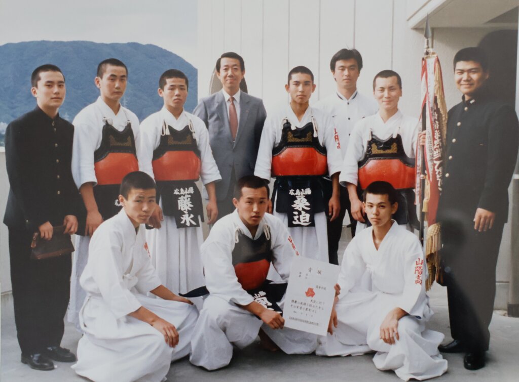中学校までその道場に通い、その後は道場の先生のご紹介から高校は剣道特待で入学しました。それが広島山陽学園山陽高校という学校。当時はまだ男子校で、とにかくスポーツが盛んなところでした。剣道部の顧問を務めておられたのは広島県警師範、広島大学師範などを歴任されていた大森玄伯先生(範士九段)。大森先生の指導のもと、剣道部もまた盛んに活動していましたが、結果的に県大会ではすべて2位に終わってインターハイ出場には手が届きませんでした。私自身は2年生から選手に起用していただいたのですが、当時の4人の3年生の先輩がとにかく強くて、その4人ともに国体選手に選考されたくらいの実力者。それだけにインターハイ出場も確実視されていましたが、決勝戦で安芸高校の前に敗退。あれはとくに悔しい記憶として心に刻まれていますね。