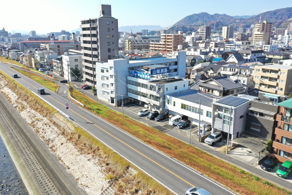 測量機器を取り扱っている業者は、おそらく中四国だけでいえば6社ほどですから、決して多いとは言えないですね。 ウチの会社の規模で言いますと、広島に本社があり、そのほか山口、島根、大阪、東京にも事務所があります。東京の事務所は営業のために構えている場所で、山口と大阪には7人、島根には3人のスタッフがいて、全社を合わせると従業員は52人になりますね。従業員数では業界内でも多いほうで、全国的に見てもおそらく二番手くらいかなと思います。