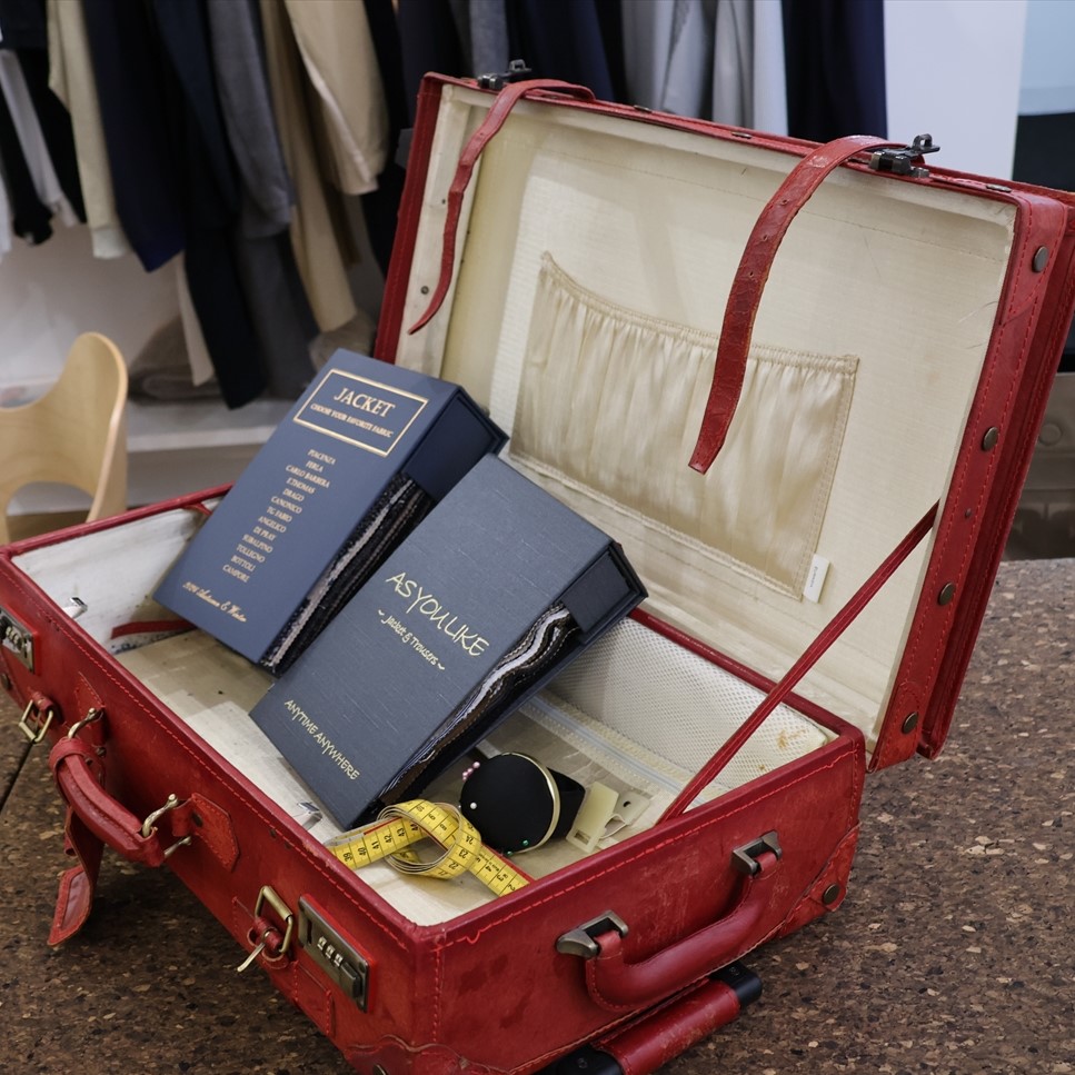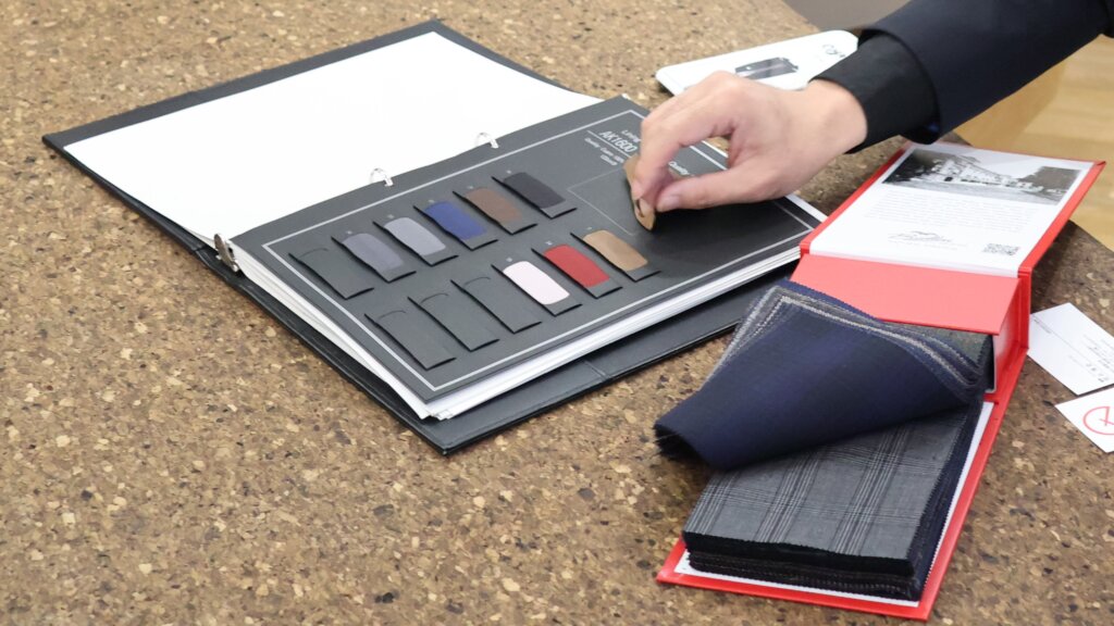 僕が実際にやる仕事としては、お客さまのお話をうかがって生地サンプルをお見せしたりデザインを提案したり。だいたい1時間から1時間半ほどお話をするのですが、やはりお客さまには必ずお一人お一人にストーリーがあって、たとえば結婚式でお父さまが着る一着だったり、入学式に向けての一着、あるいは旦那さんへのプレゼントだったりと本当にさまざま。それぞれの思いをお聞きして、いっしょに世界に一着しかないスーツをつくり上げていく仕事です。