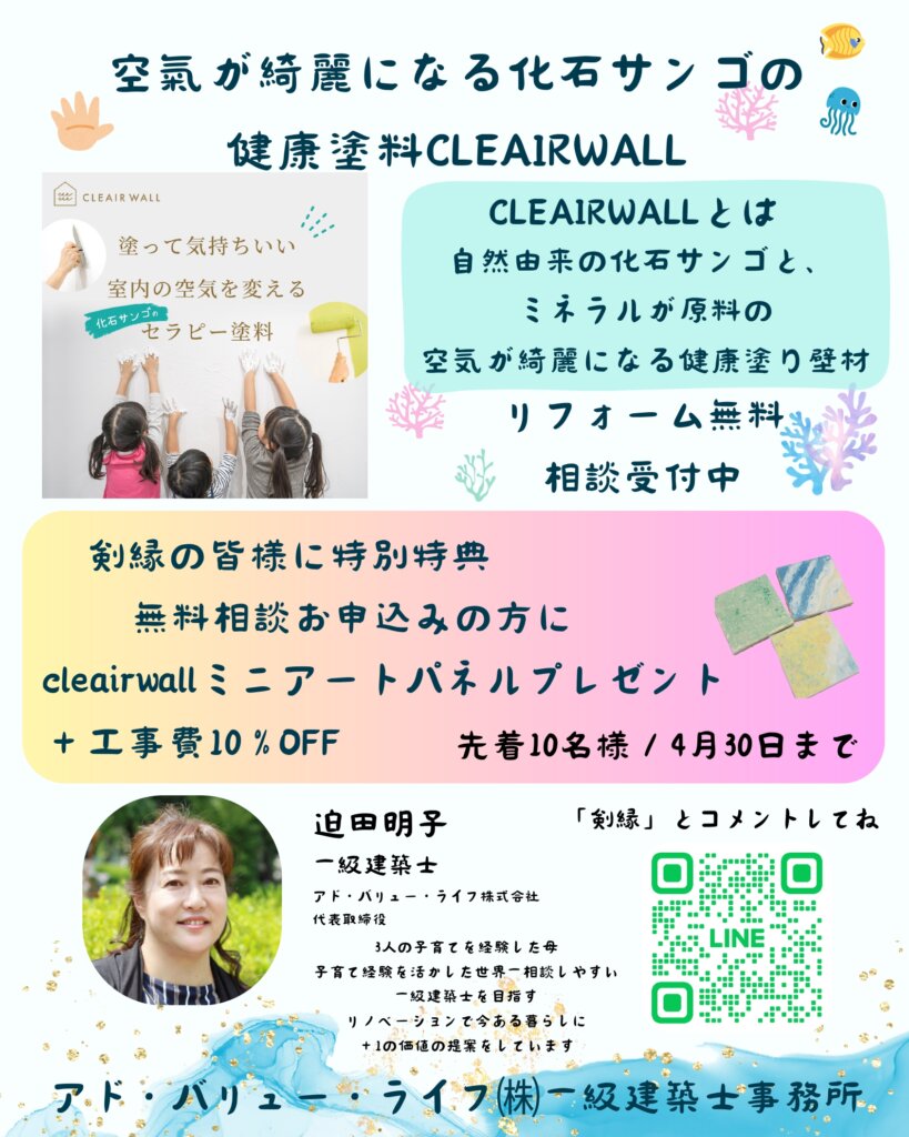 剣縁法人会員であるアド・バリュー・ライフ株式会社の迫田明子代表は、一級建築士として、また子育てをしてきた主婦として、シックハウス症候群や化学物質過敏症等の相談を受けてこられました。