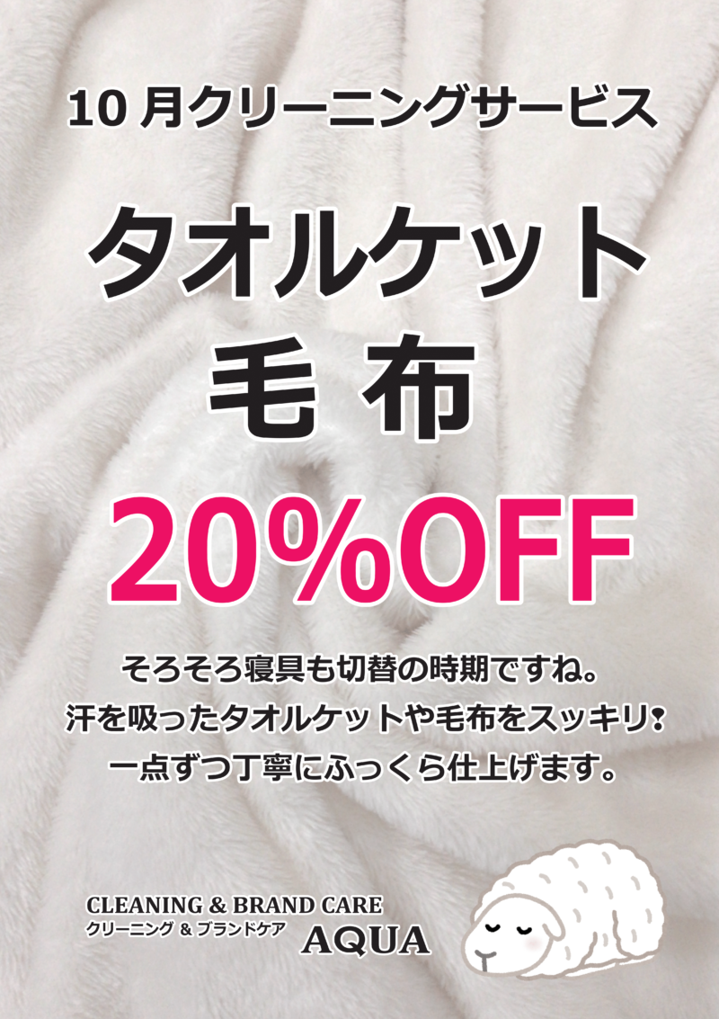 剣縁法人会員のアクアコーポレーションさんが運営されるクリーニング&ブランドケアAQUA(アクア)でも、10月のマンスリーキャンペーンはタオルケットと毛布のクリーニングが20%OFFです!