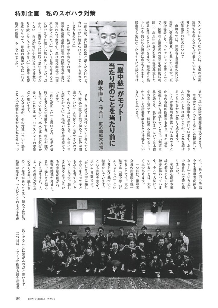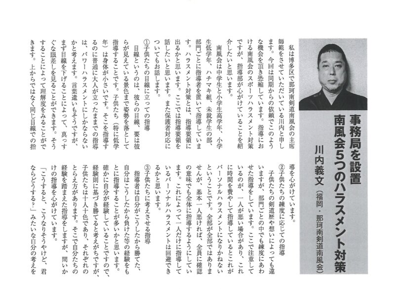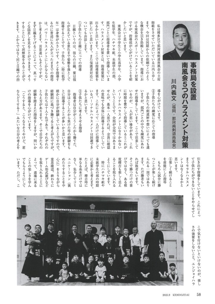 既にご覧になられた方も多いかと思いますが、このたび『剣道時代』の最新9月号で<私のスポハラ対策>という特集企画が組まれ、剣縁法人会員・川内電気商会の川内社長も寄稿されています。川内社長は福岡市博多区の那珂南剣道南風会で主席師範を務めておられ、そこでの心がけや工夫を紹介されていますので、是非参考にしてみてください。また、ここでは特集企画の全貌をご紹介することができませんが、関心のある方は『剣道時代』9月号を手に取ってみてください。