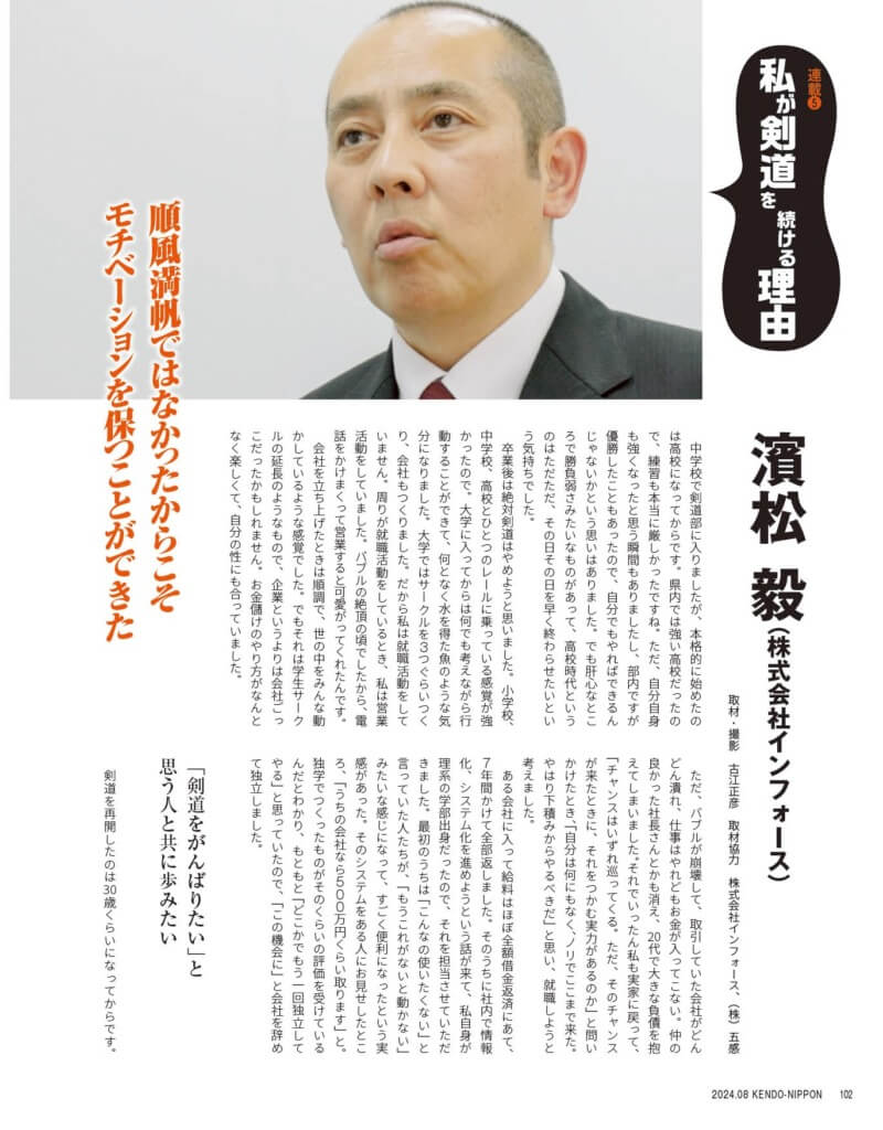 剣道日本8月号に、剣縁法人会員の株式会社インフォース 代表取締役 濱松毅さんへのインタビュー記事が掲載されました。