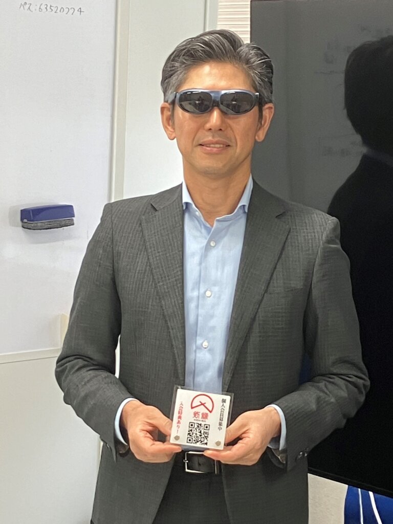 「剣縁の皆さんにご紹介できる自社製品って無いんですよね」と向山さん。鉄鋼メーカーで建築に纏わる製品の開発とか販売がご事業なので、そりゃそうだよな。B2Bで会員間が繋がることは想像できてもB2Cは・・・。「でも、こんなのはどうだろう」と差し出されたのが冒頭の写真で向山さんが装着されているメガネ型ウェアラブルデバイス。スマホ画面を目の前で大画面にできると同時に、マルチディスプレイとしても機能する。確かに、装着した状態で視線を下に向けると、スマホ画面をちゃんと見ることができる。「デスクではマルチディスプレイで大画面が当たり前になった。出先でスマホをビジネスツールに使うにしてもマルチディスプレイで大画面じゃないとしんどいじゃないですか。僕にはもはやマストアイテム」とのこと。ビジネスパーソンがパフォーマンスを追求する飽くなき姿勢を垣間見た。