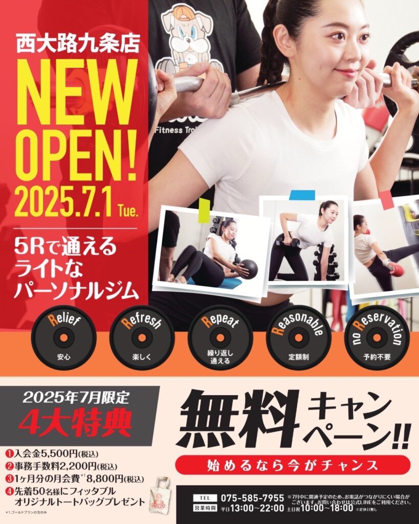 オープン月の7月には太っ腹なキャンペーンも用意されているようですので、京都のみなさま、健康な身体づくりに是非、<FITABLE>のご利用を!