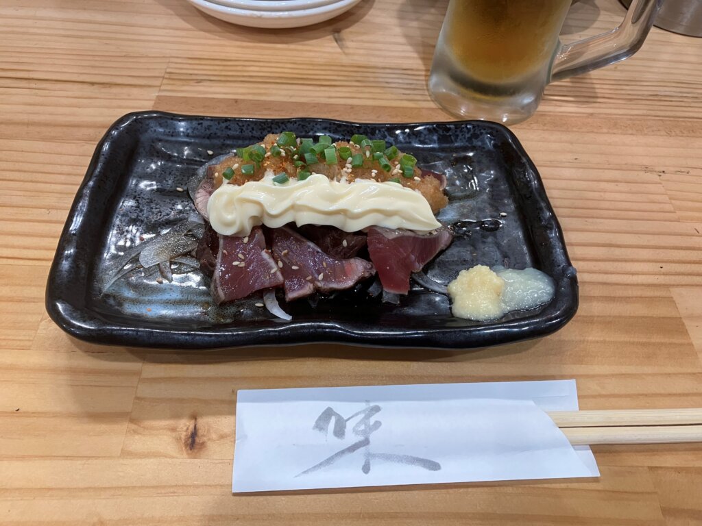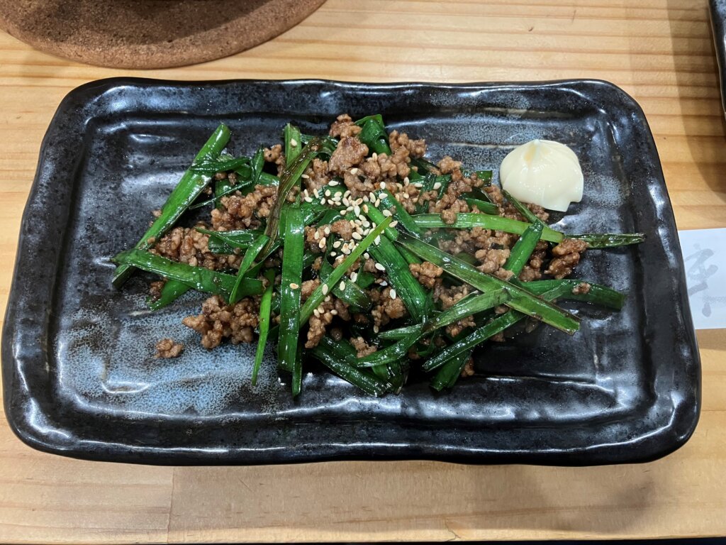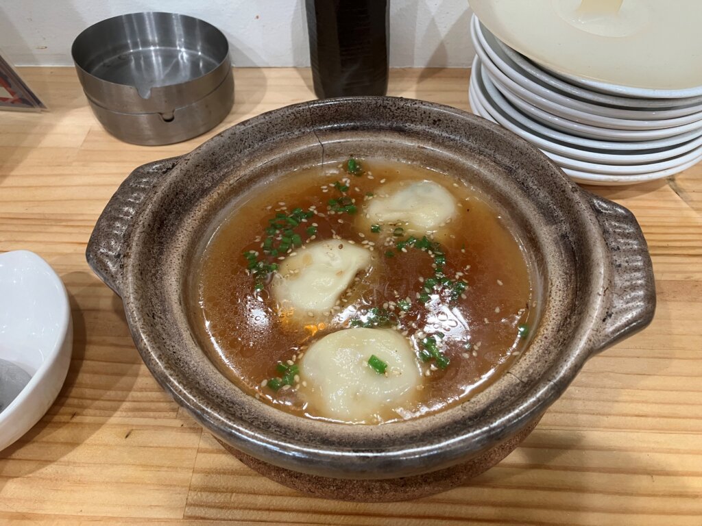 『かつおのタタキ』の上には大根おろしとポン酢、そこにマヨネーズが有無を言わさずに鎮座。ミョウガとネギで育ったもののマヨラーでもある筆者はリピ確定。『鶏のから揚げ』は下味が絶妙。サラッと(サクッとというよりもサラッと)揚がっているので、大振りでもひとくちで。『餃包(ギョウパオ)』のベンチマークは東京・六本木の餃包。今回は水(すい)餃包で。名前も見た目も中華だが味は和と韓。ビールとの相性抜群。『肉ニラ炒め』は千葉県勝浦で学生時代を過ごした方々は必ず食べて帰るという逸品。武大OBOGじゃない皆さんも是非。次は白ご飯と一緒に。
