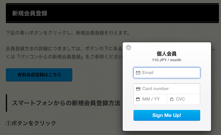 Stripeのクレジットカード入力画面がポップアップで出てきますので、以下の項目のご入力をお願いいたします。