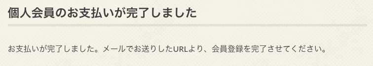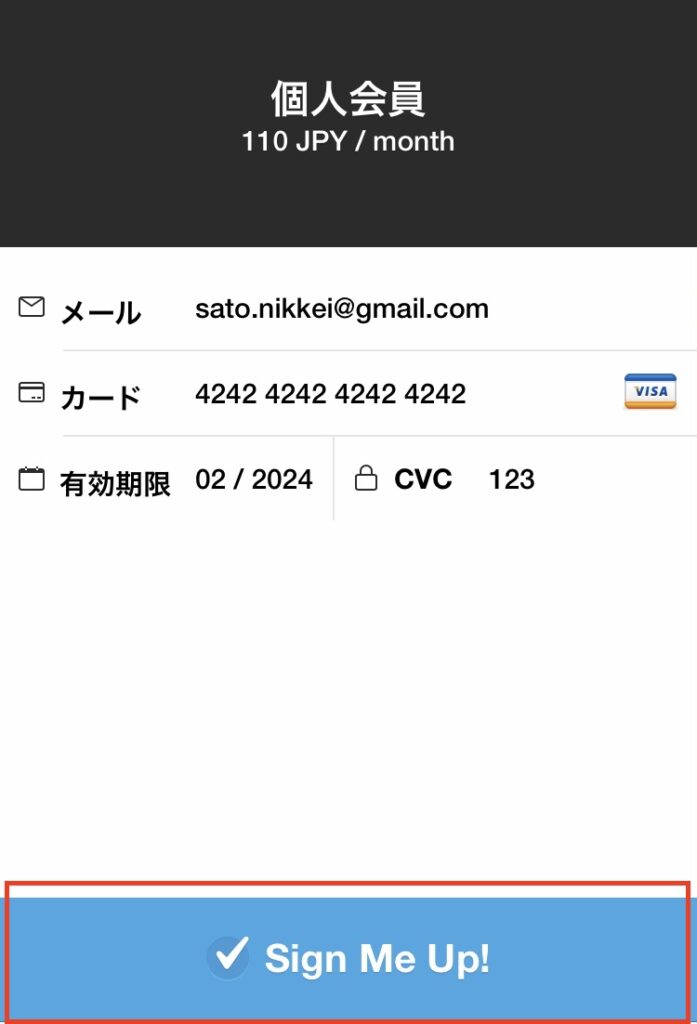 「Sign Me Up!」をクリックし、お支払いが完了するとボタンが緑色になり、数秒後に「個人会員のお支払いが完了しました」というページに転送されます。