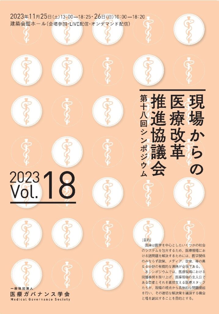 2006年より毎年、年に一回、「現場からの医療改革推進協議会シンポジウム」を開催しています。今年が18回目となり、11月25日(土)、26日(日)に、会場参加・Live配信・オンデマンド配信(1週間)で開催します。