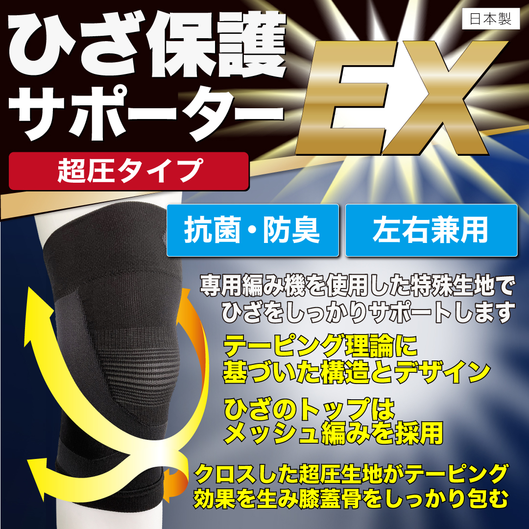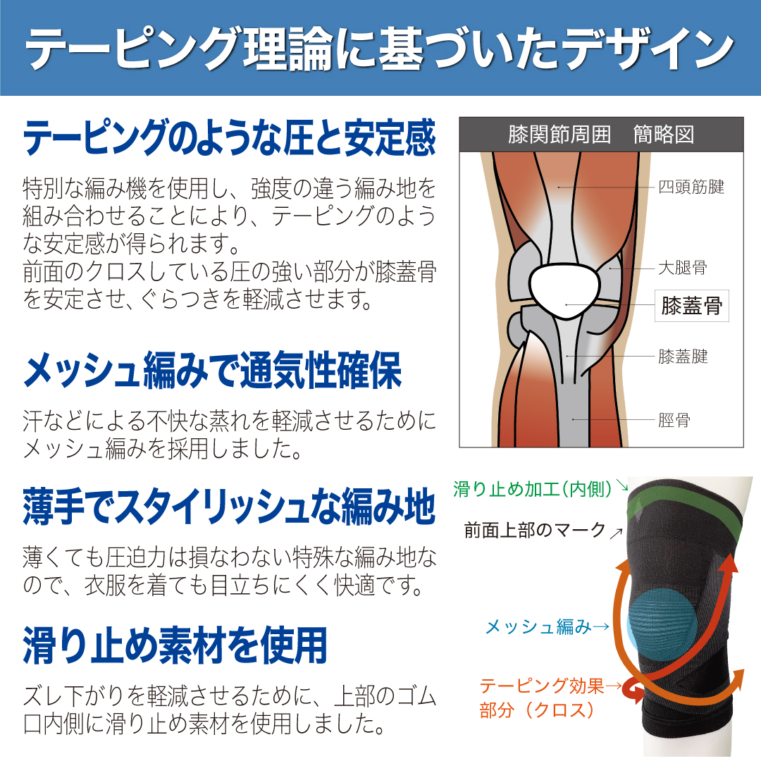 特別な編み機を使用し、強度の違う編み地を組み合わせることにより、テーピングのような安定感が得られます。前面のクロスしている圧の強い部分が膝蓋骨を安定させ、ぐらつきを軽減します。