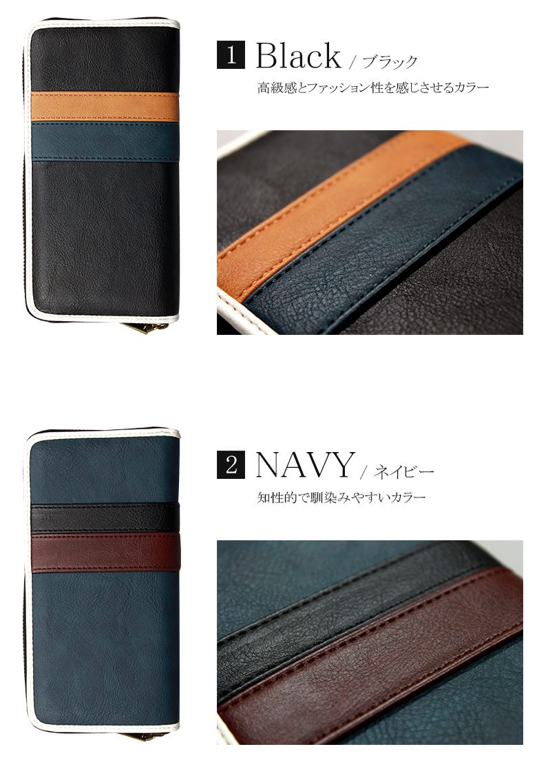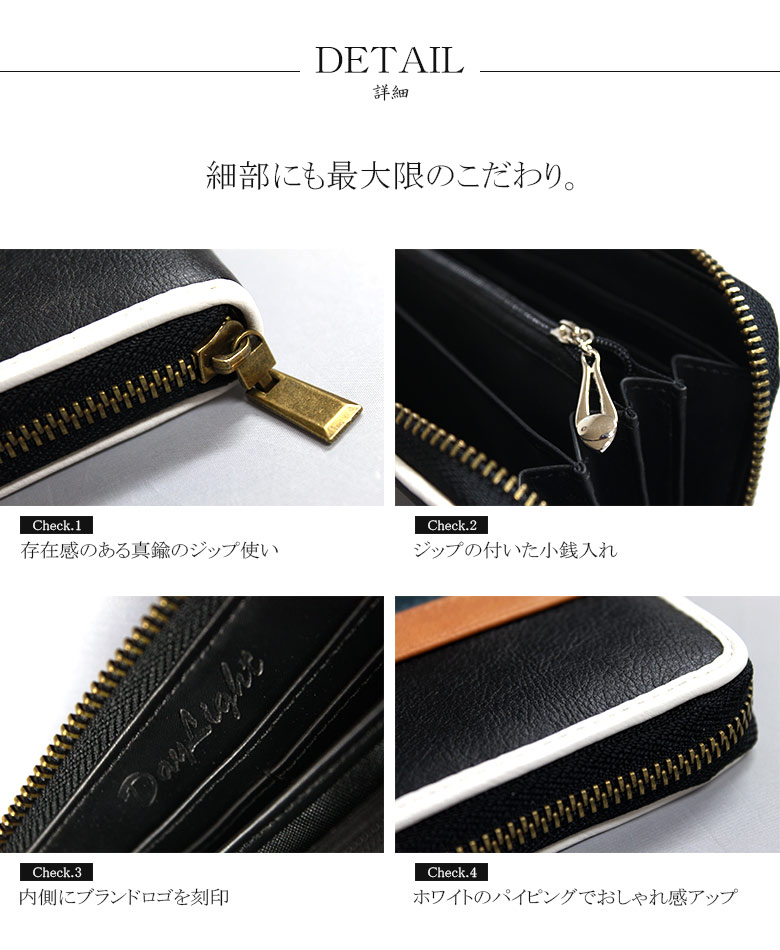 シックなカラーリングで上品さをキープし、ホワイトのパイピングでおしゃれ感を得たロングウォレット。シワ加工が施された表面は、使い込めば使い込むほどに、風合いが出てあなたの手に馴染んでいきます。