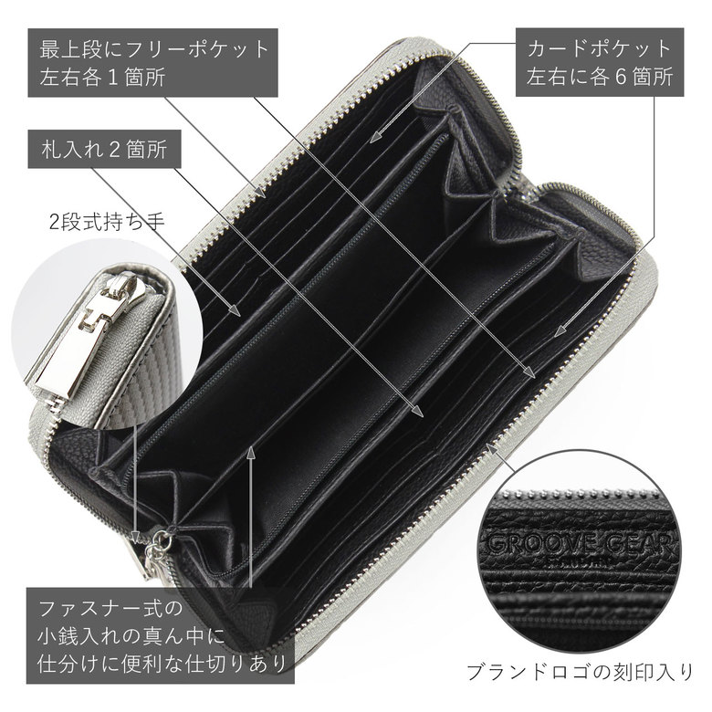 ・仕様:札入れ2箇所 / カードポケット 左右に各6箇所 / 最上段にフリーポケット 左右各1箇所 / 仕切り付ファスナー式小銭入れ 1箇所