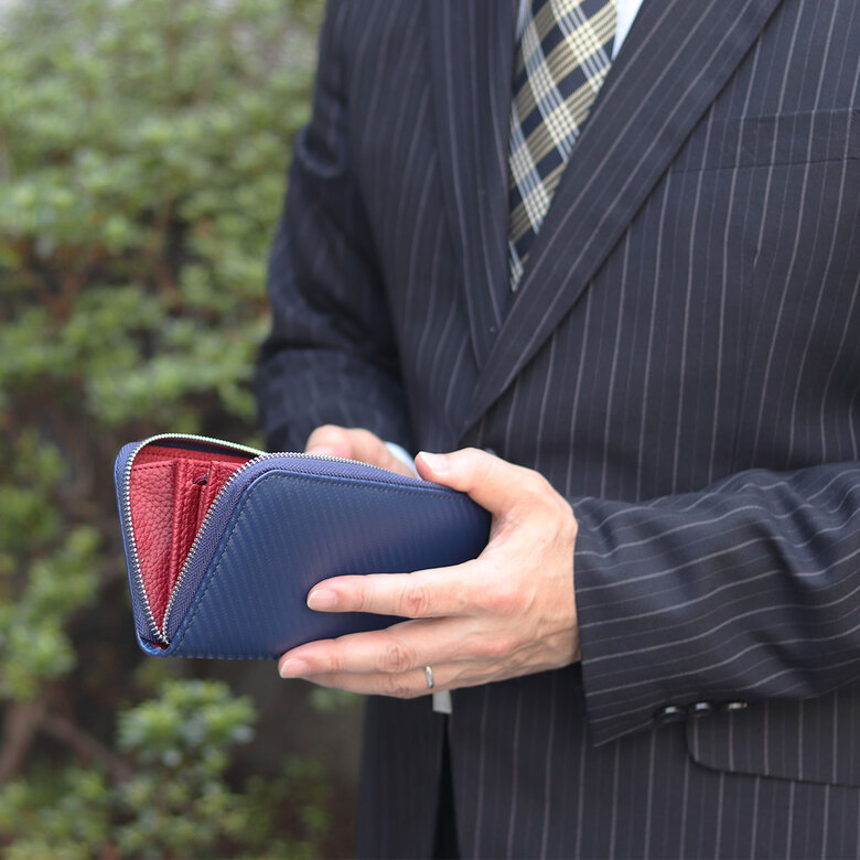 財布を開くとシボ感のある上品な生地が目を惹きます。 遊び心のある色のインナーが醸し出す高級感と贅沢さが魅力的な大人の財布です。