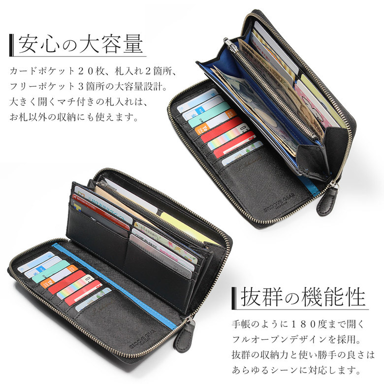 カードポケット20枚、札入れ2箇所、フリーポケット3箇所の大容量設計。