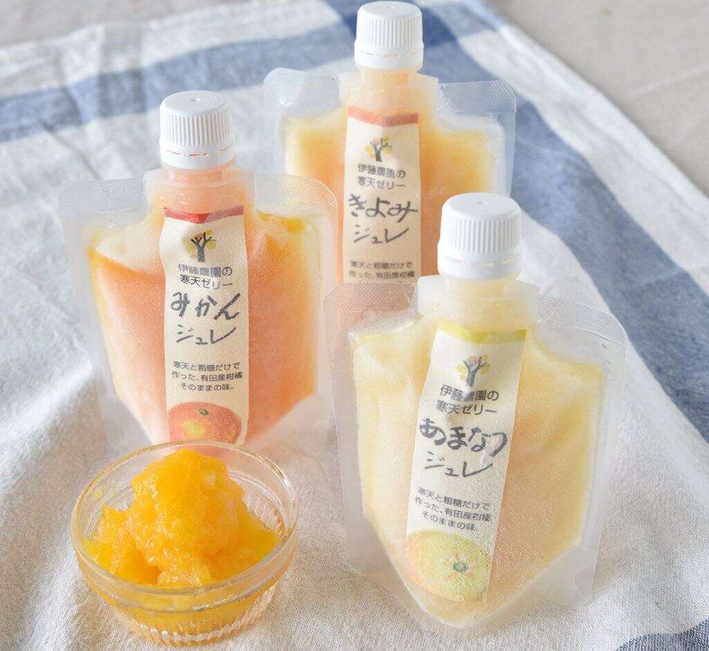 地方の温州みかんや柑橘を使用したみかんゼリーはたくさん流通していますが、ほとんどの商品で一般的にペクチンやゲル化剤、果糖ぶどう糖液糖などの食品添加物が使用されています。伊藤農園のジュレは「素材そのまま」「安心・安全」をお届けしたい思いから「寒天」と「粗糖」のみを使用。伊藤農園独自の搾汁方法で搾った濃厚な果汁の味わいと寒天特有の口の中でとろけるような食感をお楽しみいただけます。