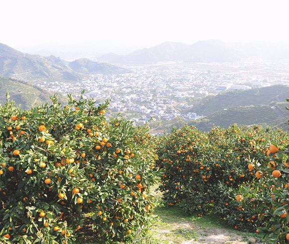 100%ピュアジュースに使用するみかんは全て和歌山県産です。和歌山では山地の多い地形を利用し、斜面に段々畑をつくってみかんを栽培しています。この段々畑のおかげで、水はけがよくなるのに加えて、太陽と黒潮から吹く潮風がみかんの木全体に満遍なく当たり、甘味の強い美味しいみかんが育ちます。伊藤農園は、1897年の創業以来、みかんの一大産地有田でみかん産業を担ってきました。