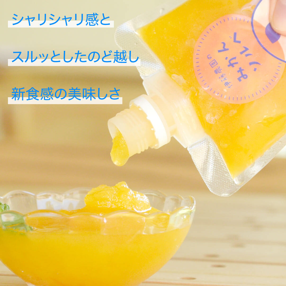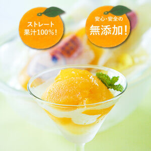 一般的にソルベと聞くとお酒が入ってる?と思われるかもしれませんが果汁+寒天+粗糖だけで作り 大人からお子様まで楽しめるやさしい商品に仕上げました。