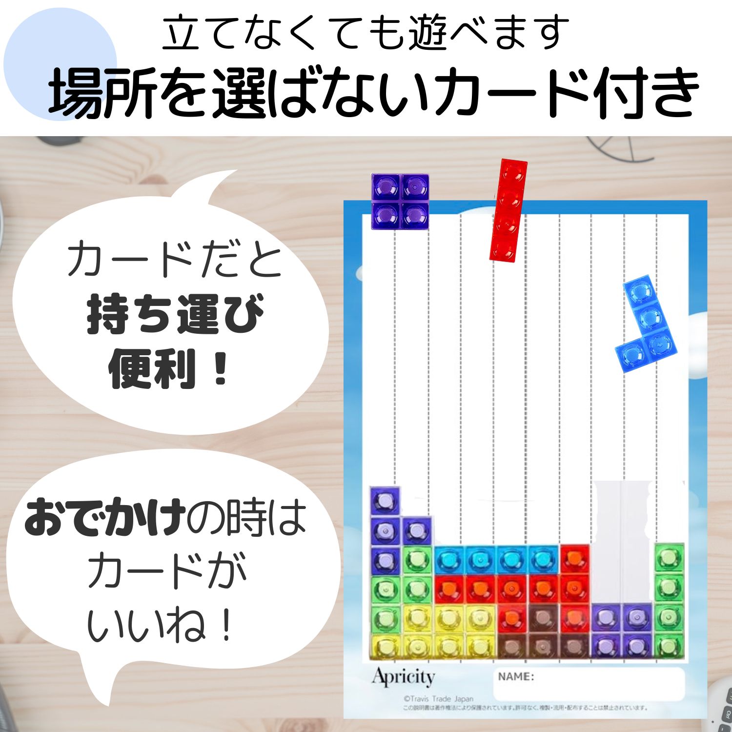 パズルのピースと付属のカードがあれば、どこでもキャンディパズルが楽しめます。立てかけて遊べない場所でも、カードがあればみんなでテトリス風のゲームをすることができます。旅行や、待ち時間、お友達のお家など外出先ではカードを使ってみんなで遊ぶのも楽しいです。