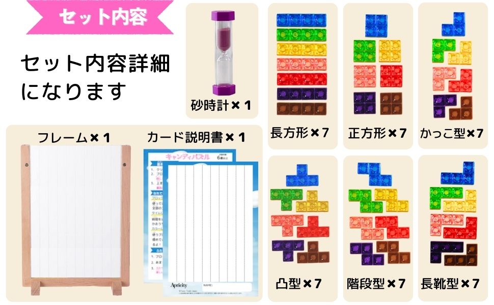 遊び方カード / 木製枠 / クリスタルブロック / 砂時計(1分計測)