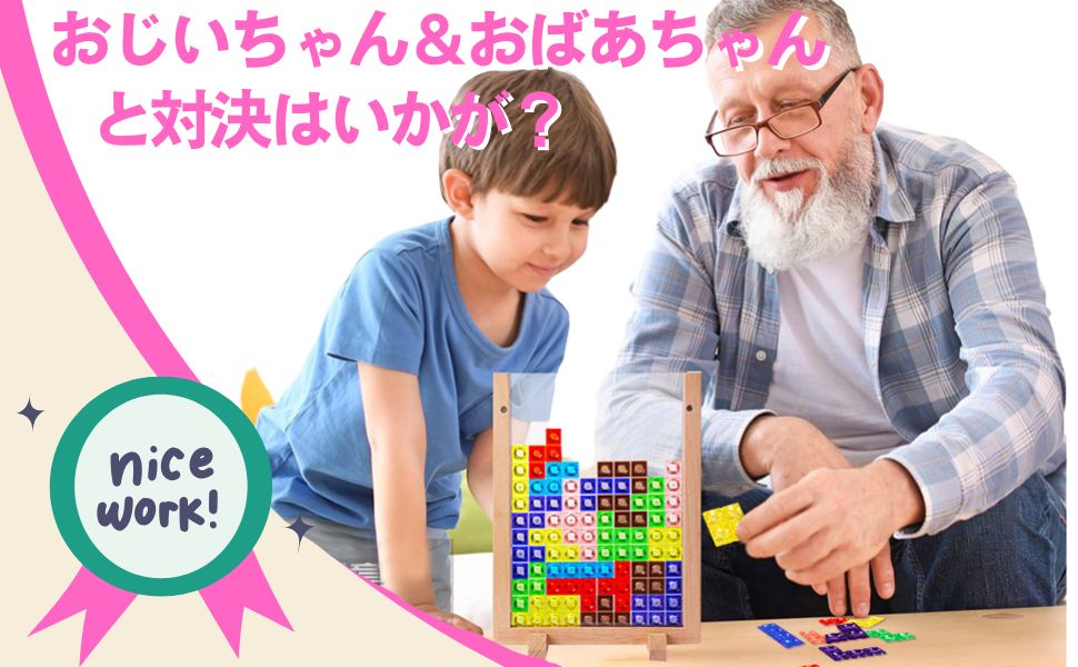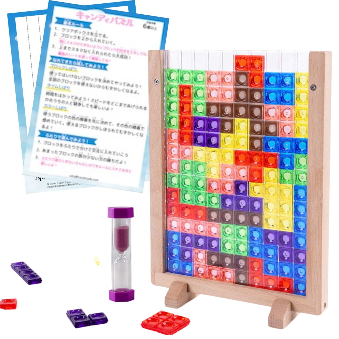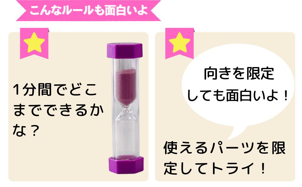 1分間を測れる砂時計がついてきます。お友達や家族とタイムアタックを楽しむのもオススメです!他にも「カラーしばり」や「ブロックしばり」など、色々なルールを追加してみましょう。ひとりでも楽しく、みんなでも楽しめるテトリス風ゲームは飽きがなく長い間重宝します。