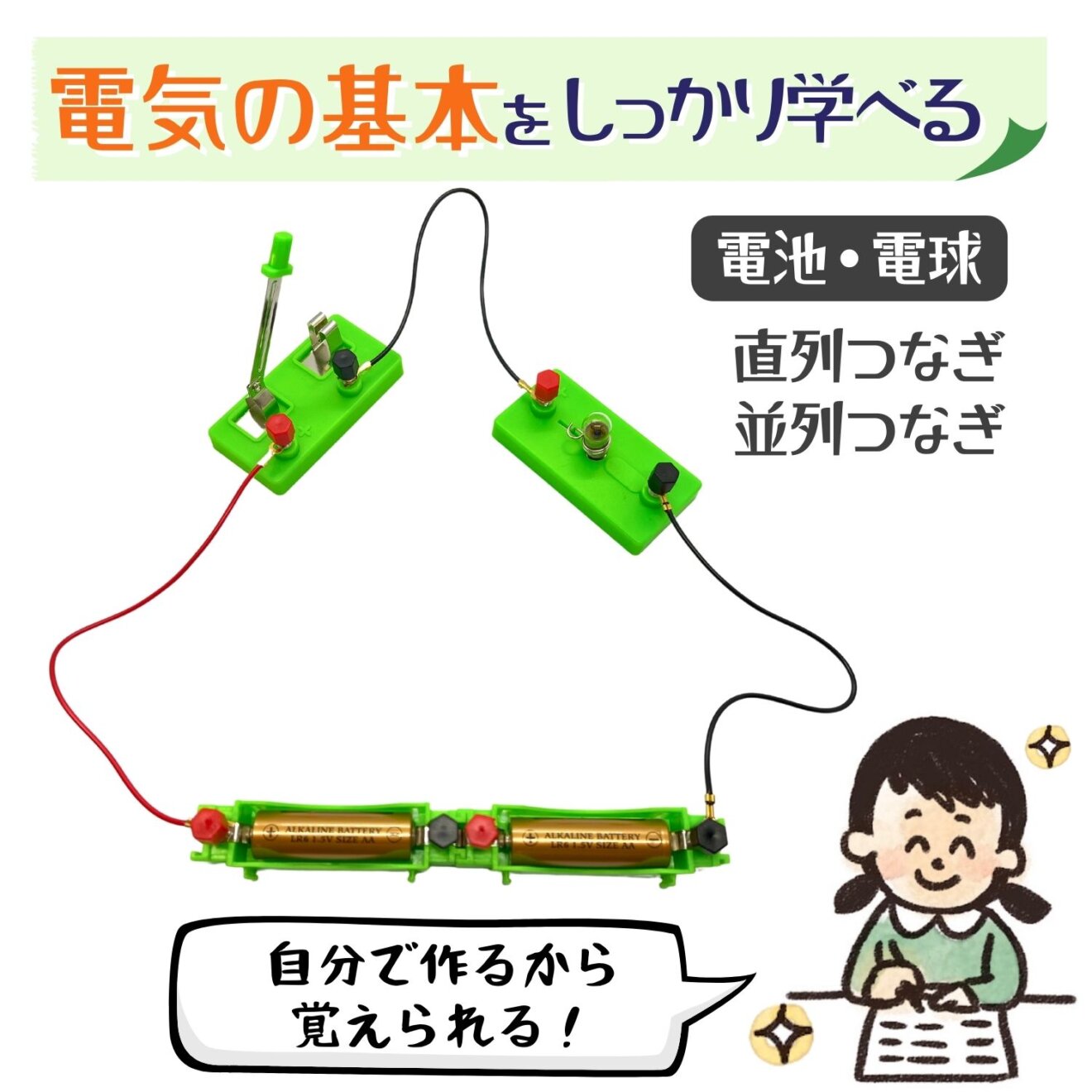電気の流れの基本を学べるキットです。日本語のオリジナルガイドブックに沿って実験していただくことで、楽しみながら理科への関心を深めていただけます。自分で予想し、実際に手を動かして体験し、その結果から思考を深めることで、学校ではカバーしきれないお子様一人一人の興味や能力をより深く育むことができます。理科に苦手意識を持つ前に、学校の授業で理解しきれなかった部分のフォローアップや、中学受験対策として基本の電子回路キットをお手に取っていただければと思います。
