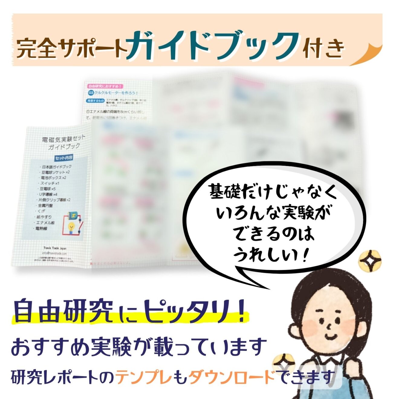 電気の単元に自信のない保護者の方にも安心していただけるよう、オリジナル日本語ガイドブックが付いてきます。基本の直列つなぎ・並列つなぎから、自由研究向けの実験までステップアップしながら楽しく取り組んでいただけます。中学受験の準備としても、実際に回路を組み、電気の流れを実感することでより深く身につけることがきます。ご家庭でのフォローアップにご活用ください。