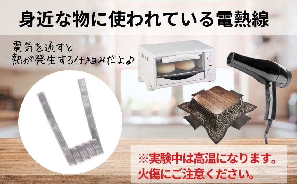 実験は必ず保護者の方と一緒に、十分に注意して行ってください。電球や電熱線は発熱するため、実験中は電球・電熱線やその周囲が非常に熱くなることがあります。火傷や火災の危険性に注意し、電球・電熱線が冷えるまで触れないようにしましょう。保管する際は、電池や電球は外してください。電池は別途保管をお願いいたします。電気の流れ過ぎ(ショート)は大変危険です。ガイドブックの説明をよく読み、手順に沿って実験を行ってください。乾電池は別売りです。実験によって、ご家庭でご用意いただく材料がございます。予めご了承ください。