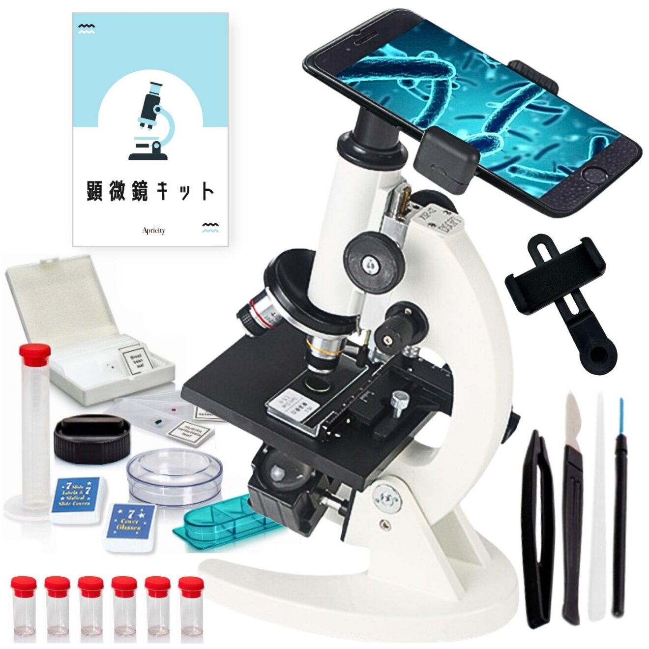 日本語取扱説明書、顕微鏡、スライドガラス、カバーガラス、丸型カバーガラス、標本用ラベル、標本プレパラート、マイクロスライサー、観察ケース、シャーレ、サンプルボトル、メモリ付き試験管、撹はん棒、柄つき針、ピンセット、解剖ナイフ、スマートフォンホルダ、収納パッケージ