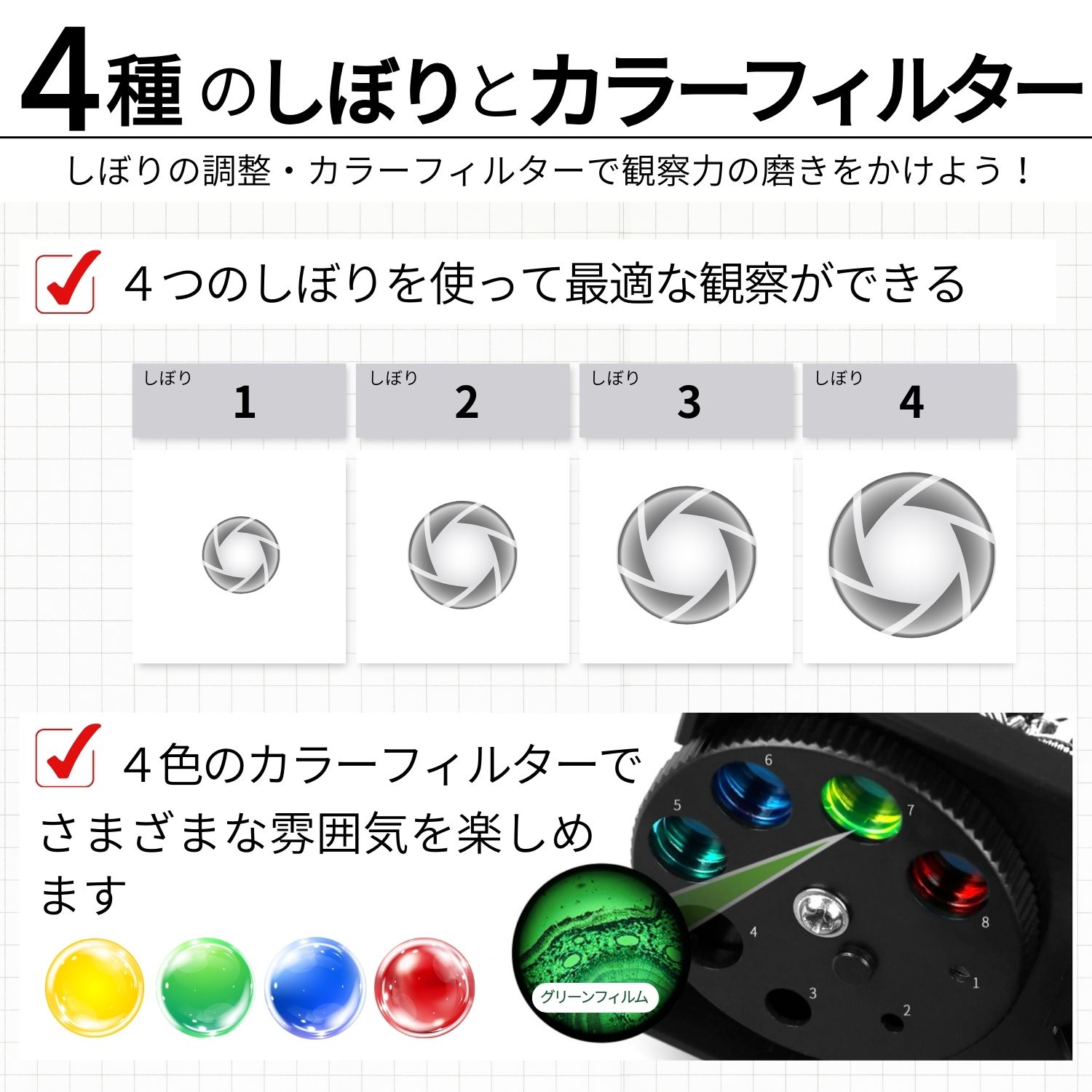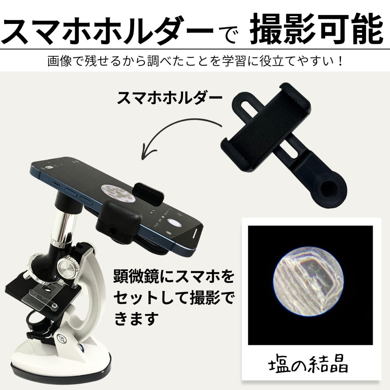 見たままを写真で残せるように、スマートフォンホルダがついてきます。直接顕微鏡をのぞいて観察する体験と、観察結果をじっくり分析して考察する時間。どちらもお子様の理科への興味を一層深めてくれます。