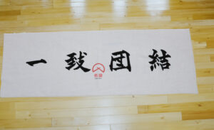 筑波大学の書道家 長谷川 智先生の直筆で書いて頂いた「一致団結」を一面に描いています。